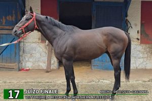 -E mais uma vez o Bigboss foi às compras. No Leilão TBS realizado na quarta feira 11/03, Joaquim Moreira da Silva arrematou o lote 17, o castanho Juizo Finale. Trata-se de um macho castanho de 06 anos, filho de Vettore (IRE) e Ressacada,criação do Haras Nijú. Tem 24 apresentações ma Gávea e 22 no Cristal. Na Gávea, venceu quatro provas e se colocou em 13 saídas a pista. No Cristal, venceu três corridas e se colocou em 15 oportunidades.