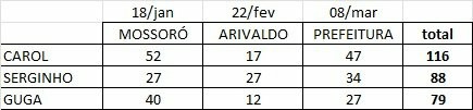 -No concurso de palpites dos membros da live do JCPE, Carolina Fonseca aumentou a vantagem sobre os adversários. O placar está assim: Carol Fonseca com 116 pontos; Serginho Santana vem na formação da dupla com 88 pontos e Guga, com boleto inchado, nutaliose e deixando ração, ocupando a lanterna com 79 pontos. Confira a pontuação por corrida.